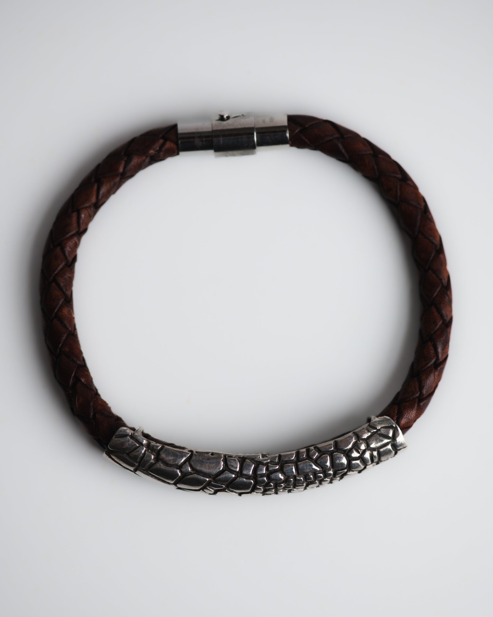 Hand carved sterling silver, leather, stainless steel clasp.